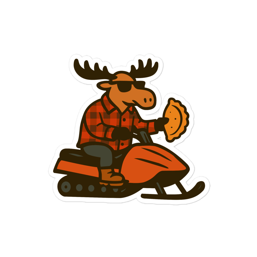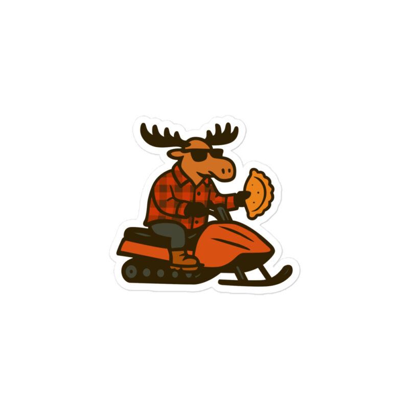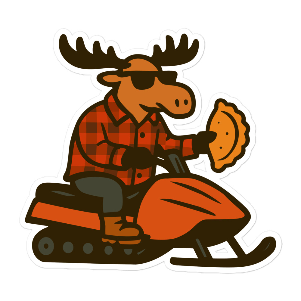 This sticker features Jimmer riding a snowmobile while carrying a fresh pasty!